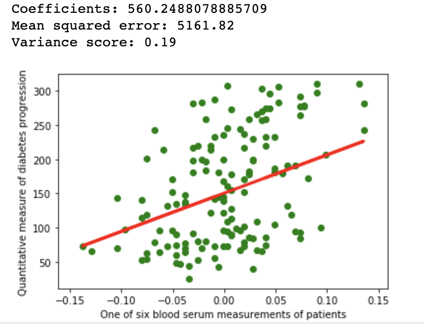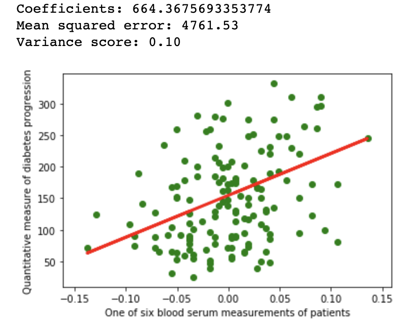 Linear regression example on Scikit diabetes dataset with fixed seed
